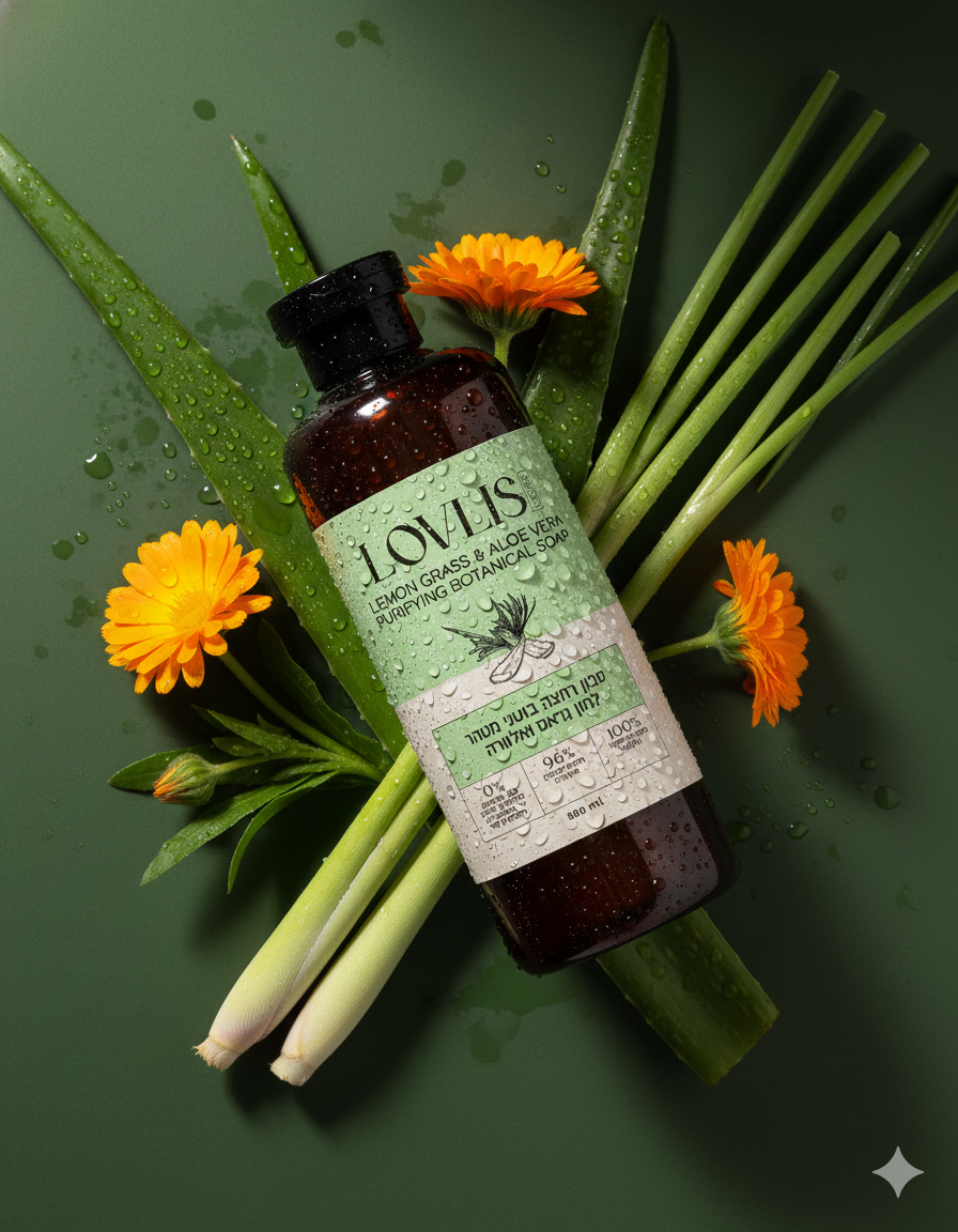 מכיל: שמן למון גראס אורגני, שמן לבנדר, מי אלוורה, תמצית קמומיל ותמצית קלנדולה.