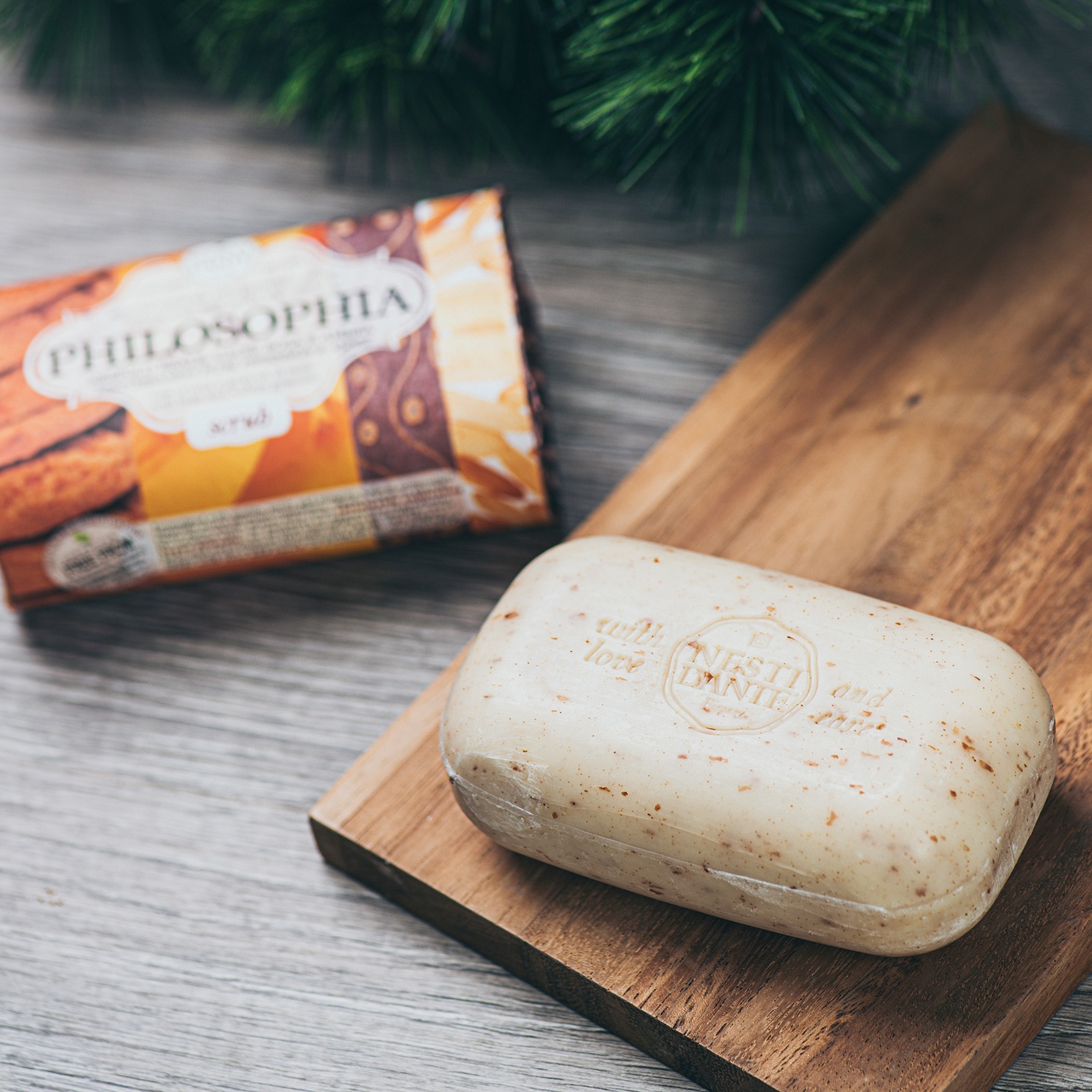סבון מוצק גרגרי אגוזים שזיף אפרסמון ואמבר מעניק פילינג עדין לניקוי עמוק של העור.