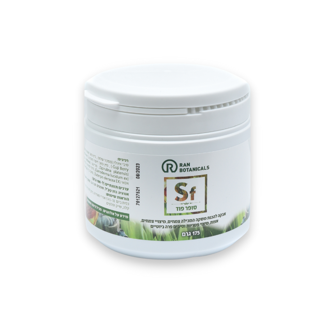 סיבי אינולין (ממקור עולש), מיץ עשב שעורה מיובש (Barley Grass juice powder), אטד סיני (Lycium barbarum -Goji Berry), מיץ עשב חיטה מיובש (Triticum aestivum L), אצת כלורלה (Chlorella vulgaris, אצת ספירולינה (Spirulina platensis), מורינגה (Moringa oleifera), מאקה (Lepidium meyenii ), מיצוי פטריית ראישי (Ganoderma lucidum ex), מיצוי מאיטקי (Grifola Frondosa EX), מיצוי שיטאקי (Lentinus Edodes EX), מיצוי אסאי (Euterpe oleracea EX), מאקי ברי (Aristotelia chilensis), מיצוי רימונים (Punica granatum TEXT).